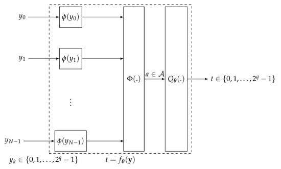 In the information bottleneck receiver, however, the aim is to directly process the q-bit integer indices and . The function describes a channel output quantizer that is also designed to preserve the maximum relevant information with the information bottleneck method as explained in []. Please note that the design of the channel output quantizer is not discussed in detail in this article. However, we want to mention that it requires handling continuous observed random variables with the information bottleneck method, which has not been discussed in this article so far. A simple method to deal with continuous observations for the quantizer design problem is approximating the continuous variables as very finely quantized discrete variables. More details on the quantizer design with a desired maximum preservation of relevant information can be found in [,].