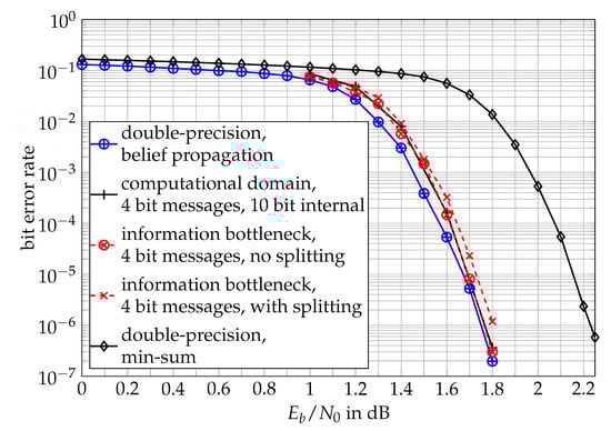 - Lewandowsky, J.; Bauch, G. Trellis based node operations for LDPC decoders from the information bottleneck method. In Proceedings of the 2015 9th International Conference on Signal Processing and Communication Systems (ICSPCS’2015), Cairns, Australia, 14–16 December 2015; pp. 1–10. [Google Scholar]