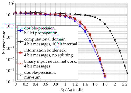 Figure 15 shows the bit error rate results of the neural network method for implementation of the node operations from []. The simulation setup, the used LDPC code and the number of decoding iterations were the same as those for the computational domain approach from the prior section.