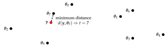 In the figure, the parameters reflect the positions of the points labeled in the two-dimensional plain. In addition, an exemplary two-dimensional input vector is shown as a red dot. The outcome of the operation is the integer index t of an approximate or exact nearest neighbor of the input vector under some arbitrary distance measure . In Figure 16, the distance is the Euclidean distance, and the exact nearest neighbor is considered for illustration purposes. Please note that it is not required to calculate all possible distances to determine the system output t. Instead, either an exact or approximate nearest neighbor search using very efficient search algorithms in graph structures of the parameter vectors can be applied [,]. The parameters involved in nearest neighbor search-based mappings were trained using genetic algorithms in [,]. Genetic algorithms are parameter optimization algorithms which are inspired by the natural evolution of the species [].