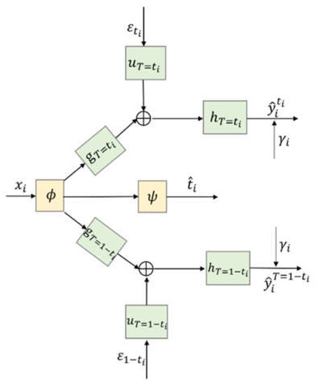 Figure 1 shows the architecture of the proposed CSA–Dragonnet. The CSA–Dragonnet consists of three parts, i.e., (i) as in the CSA [4] and Dragonnet [10] models, the baseline of all patients from is mapped onto a latent representation by an FCN (ii) as in Dragonnet [10], in order to reduce the influence of the non-confounders in the representation space, a single-layered FCN with as the input is used to predict the probability of the treatment, i.e.,; (iii) as in the CSA model [4], in order to predict and , of all the patients are divided into two parts, i.e., for patients from and for patients from , which are further fed into two groups of networks on the top and bottom branches of Figure 1, respectively. In the two branches, , , and (with * = 1 or 0) are all FCNs, and are specially designed random inputs [4], and denotes the concatenating operation rather than summation, i.e., the input of is a vector composed of and . The random inputs and are utilized to introduce some randomness model in the time generation process [4]. Please refer to reference [4] for the details of the non-parametric survival model.
