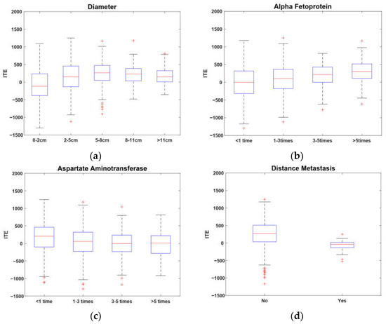 In Figure 4, a box-plot is used to illustrate the relationships between the ITE and the four key covariates. It is apparent from Figure 4a that the ITE increased with the increase in tumor diameter when it was less than 8 cm. In contrast, when the diameter was less than 2 cm, the median was less than zero, which indicates that patients with numbers less than 2 cm may not benefit significantly from a hepatectomy. As a whole, patients with tumors between 5–8 cm could benefit the most from a hepatectomy. Figure 4b indicates that the ITE increased with the increase in alpha fetoprotein, while Figure 4c shows that the ITE decreased with the increase in aspartate aminotransferase. It can be inferred that the benefit of a hepatectomy is positively associated with liver function. Figure 4d shows that patients without distant metastasis had higher benefit ratios than those with distant metastasis in terms of the median and upper quartile. Thus, patients without distant metastasis have a high probability of benefiting from a hepatectomy.