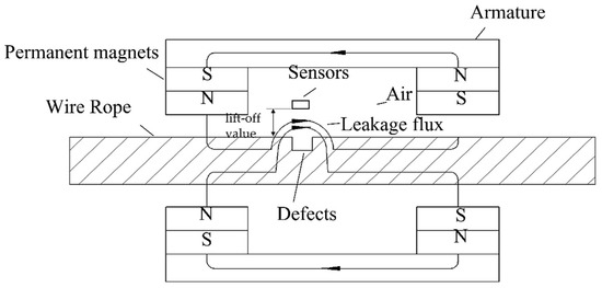 Various methods have been proposed for the non-destructive testing of wire ropes. Most of the current studies are focused on methods such as ultrasonic detection [3], electromagnetic detection [4], X-ray detection, and magnetostriction [5], as well as eddy current, current, and vibration detection [6,7]. The electromagnetic detection method is the most widely implemented method, owing to its demonstrated reliability and practicality. The basic principle of the electromagnetic-based leakage detection method used in this study is shown in Figure 1. The permanent magnet magnetizes the wire rope to saturation, forming a closed magnetic circuit among the wire rope, magnet, and yoke. In the presence of a damage, the original magnetic induction lines through the wire rope form a closed magnetic circuit in the air and generate a leakage magnetic field.