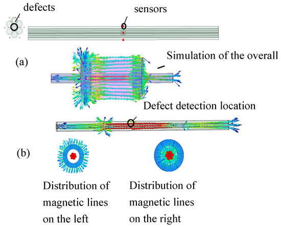 Maxwell magnetic field simulation software was used to simulate the magnetic field of the wire rope testing model. The diameter of the wire rope was set to 30 mm. The simulated wire rope was a six-strand simulation model. The middle of the six-stranded wire rope interior contained the damage defect. The magnetic vector of the left magnet of the model diverged in the outward direction, and the magnetic vector of the right magnet contracted in the inward direction. This ensured that the wire rope formed a closed loop with the left and right magnets. The permanent magnet was a NdFeB magnet with a maximum magnetic energy product of about 380 ; the gag bit was composed of pure industrial iron. We set the maximum cell length to 1 mm, the maximum operation step to 10, the permissible error rate to 1%, and the residual value for non-linearity to 0.0001. The wire rope moved as a whole along the horizontal direction from left to right, from y = −40 mm to y = 40 mm; the step size was set to 0.1 mm. Figure 3 illustrates the theoretical simulation model.