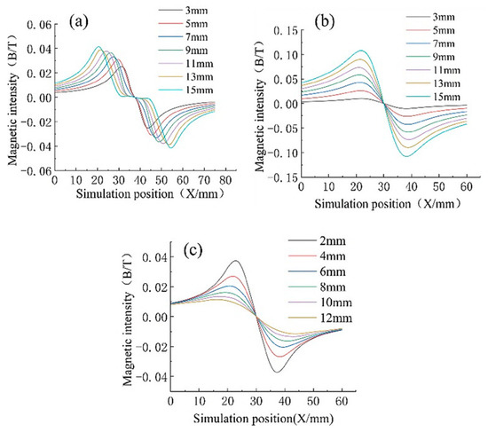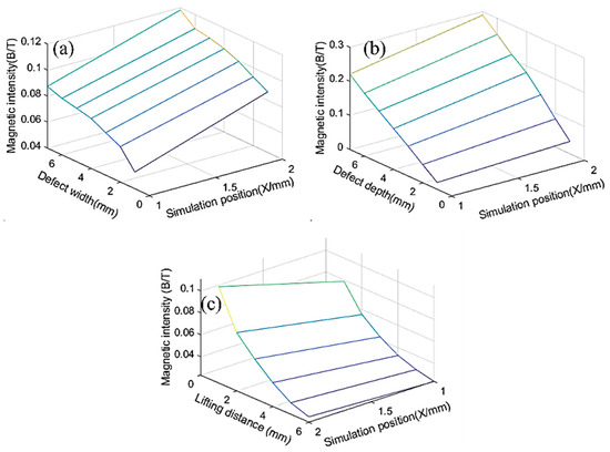 Figure 4 shows that as both the wire rope defect type and the sensor distance from the location of the wire rope were different, the corresponding magnetic force line distribution state was different. This causes a defect length and a defect depth, and the lift-off value of the formation of the magnetic field strength is different. Notably, the magnetic flux density value of the defect magnetic signal increases with an increasing defect length. However, it tends to be stable when the defect length increases to a certain range. The magnetic flux density value of the defect’s magnetic signal increases with the defect depth, and the trend is linear. The flux density of the defect signal decreases with an increase in the lift-off value.