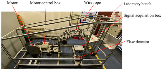 To verify the effectiveness of the proposed algorithm, in this study we designed an online wire rope inspection platform for experimental verification. The system comprised a magnetic leakage nondestructive testing device, an inspection circuit, a data acquisition module, and an overall support for the experiment. Figure 6 illustrates the overall structure.