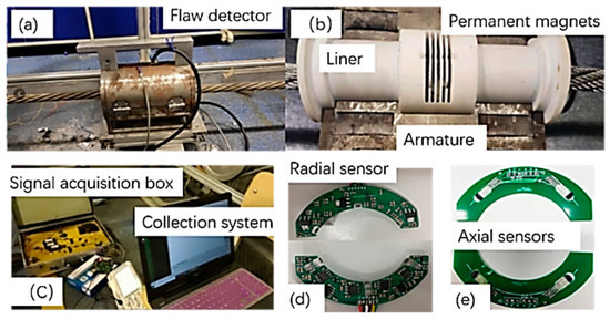Wire rope inspection system. (a) Flaw detector, (b) internal structure of the detector, (c) overall system of signal acquisition, (d) radial sensor, (e) axial sensor.