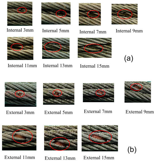 External damage defects of the wire rope were introduced to verify the difference in signals between the internal defects and external defects of the wire rope. The background of the experimental design of the external defects of the wire rope was consistent with that of the experiments of the internal defects of the wire rope, wherein 14 groups of internal defects and external defects of wire rope were produced, as shown in Figure 8.