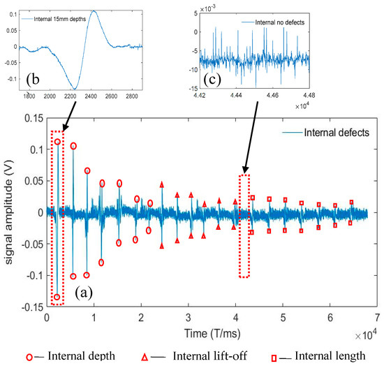 Internal defect of a wire rope: (a) the internal overall defect signal of the wire rope, (b) the interception of the damage from a 15 mm internal defect signal, and (c) the interception of an internal defect-free signal.