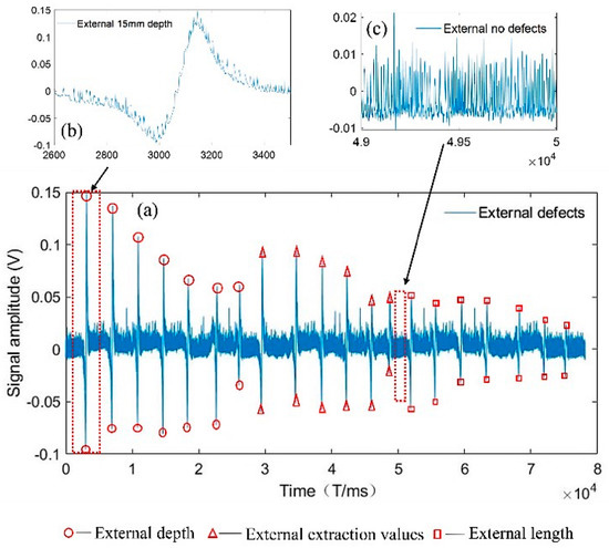 External defect of a wire rope: (a) the external overall defect signal of the wire rope, (b) the interception of the damage from a 15 mm external defect signal, and (c) the interception of an external defect-free signal.