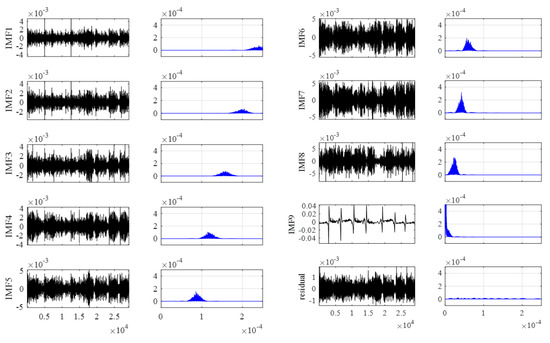 Table 1 shows that the center frequencies were close together when K = 10 and that an over-decomposition occurred; thus, a value of 9 was chosen for K. For the sake of simplicity, the subsequent analysis in this paper is focused only on the wire rope external length damage signal in order to demonstrate the display effect of the method. Figure 11 illustrates the wire rope damage signal obtained via VMD decomposition of the nine IMF components and their corresponding spectra, as well as the 10th residual for the VMD decomposition of the noise signal waveform and its corresponding spectrum.