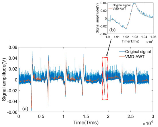 The time-domain waveform obtained following the wavelet noise reduction is shown in Figure 12a, depicting the intercepted signal at 7 mm damage. Figure 12b depicts the overall time-domain waveform. Figure 12b shows that the changes in the waveforms of the VMD-AWT noise reduction signal and original signal were consistent, and the noise signal was removed. The effective features of the original signal were well retained, and the noise reduction effect was significant.