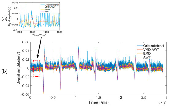 The advantages of the VMD-AWT method proposed in this paper in processing complex signals were demonstrated through comparison and analysis with AWT and EMD. Figure 13 presents the time-domain waveforms obtained following noise reduction, where (a) shows the overall time domain waveform following noise reduction and (b) shows the local signal waveform in the screenshot. Figure 13b shows that the signal curve following noise reduction obtained via VMD-AWT was smoother than that of other algorithms, and the noise component was smaller.