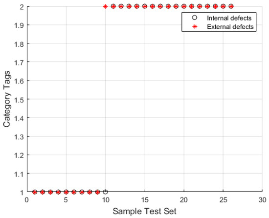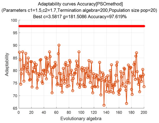 We selected 106 groups from the extracted eigenvalue samples as training samples and 25 groups as test samples. We used the RBF kernel as the training function. The PSO algorithm was used to optimize the parameters of the penalty factor and kernel function of the SVM, and Figure 14 presents the obtained fitness curve. Figure 15 presents the recognition results, which demonstrate that the optimal fitness curve leveled off after several iterations. The number of populations was N = 20 and the number of terminated evolutionary iterations was 200; the acceleration constants were = 1.5 and = 1.7, the optimal parameters obtained were C = 3.5817 and g = 181.5086, and the internal and external damage recognition rate was 97.619%.