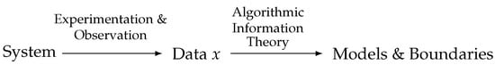 Once the data x is fixed, we face the problem of finding the best explanations for it, which is related to finding its patterns or structures. This is the main investigation of the paper. It can be done in the realm of algorithmic information theory (AIT), a branch of mathematics and logic that offers similar tools as probability theory, but with no need for unexplained randomness. Li and Vitányi, authors of the most cited textbook [11] in the field, claim that “Science may be regarded as the art of data compression” and according to the pioneer Gregory Chaitin [12], “[A] scientific theory is a computer program that enables you to compute or explain your experimental data”. Indeed, even theoretical pen and paper work constitutes symbolic manipulations which are inherently algorithmic (see Figure 1).