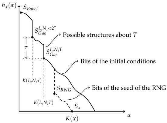 The complexity of the minimal sufficient statistics, , is known as the sophistication of the string x, which captures the amount of algorithmic information needed to grasp all structures—or regularities—of the string. Technically, here we refer to set-sophistication, as defined in [22], since sophistication has been originally defined [23] through total functions as model classes instead of finite sets. Importantly, Vitányi has investigated [24] three different classes of model: finite sets, probability distributions (or statistical ensembles, cf. the following section) and total functions. Although they may appear to be of increasing generality, he shows that they are not. Any model of a particular class defines a model in the other two classes of the same complexity (up to a logarithmic term) and log-cardinality (or analogue).