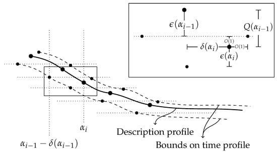 In the spirit of non-probabilistic statistics and their connection with two-part descriptions (see Section 2.2), the model S is a -two-part description for x if , and . Out of all two-part descriptions, the optimal ones are those of minimal m for a given —they are recognized as the witnesses of the structure function. The description profile is thus defined as the graph , and analogously with the time profile, this graph corresponds to the boundary of all -descriptions.