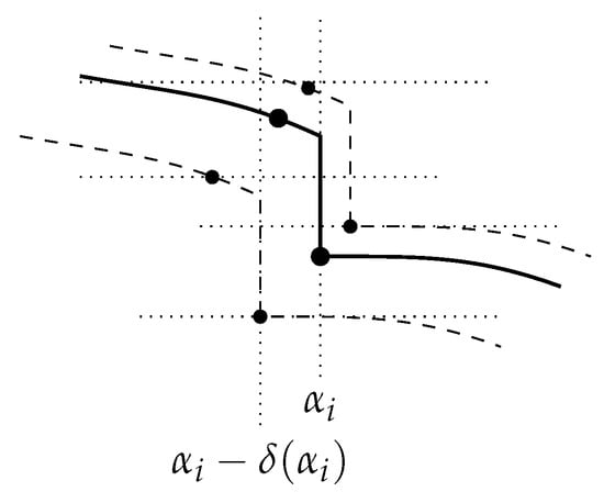 For each point of the boundary of the description profile can be drawn the course of , as well as . Note that a “drop” of the structure function is defined in Equation (6) precisely to ensure that the time profile has dropped of at least one. This ensures that the data x is logically deeper than expected from the minimal partial models of smaller complexity. The data thus contains more halting information that will be encompassed in the new minimal partial model. Indeed, as can be seen from Figure A1, there is a drop when the description profile drops by more than , compared to the previous minimal partial model of complexity level .