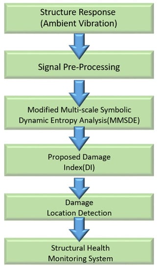 For the high performance of detecting the failure mode of planetary gears in the mechanical field, the MMSDE analysis is adopted to identify the possible damage existing in building structures. The velocity signals of each floor of the structure under ambient vibration are collected and analyzed by MMSDE with the proposed damage index. The remainder of this study is structured as follows. The methodology, including modified multi-scale symbolic dynamic entropy and the proposed damage index, is introduced first. In Section 3, a numerical model of the seven-story unidirectional stiffened steel frame is constructed. The MMSDE curves and the damage index are applied to 16 damage cases to demonstrate the feasibility of the proposed method. To verify the practicality of the SHM system, an ambient vibration experiment for a scaled-down steel benchmark structure was conducted in Section 4. The confusion matrix was utilized to evaluate the practical performance of the system. Finally, a summary is provided, and conclusions are drawn. The flow chart of the proposed SHM system is shown in Figure 1.