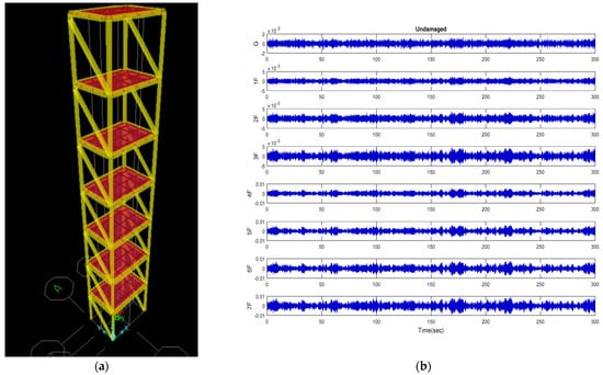 (a) Three−dimensional seven-story numerical model; (b) velocity response under ambient vibration (undamaged case).