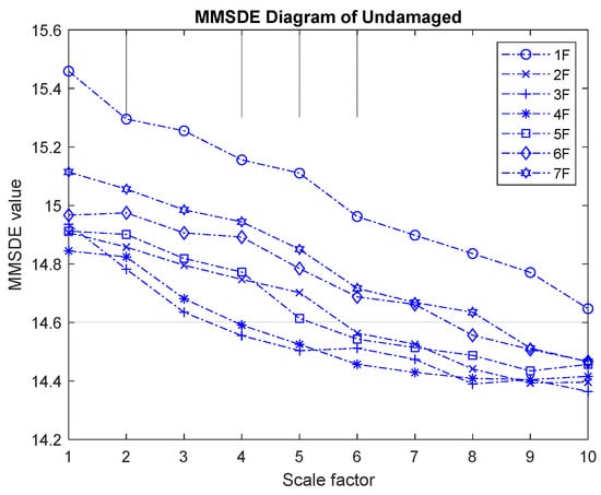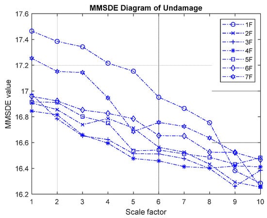 In the case of a multi-story damage shown in Figure 17 and Figure 18, the entropy curves of a health floor and a damaged floor are clustered separately, and the entropy of the damaged floor decreases at different scales, which indicates that the damaged floor would be clearly distinguished. However, when the value of the MMSDE curve of the damaged floor fails to decrease as expected, the analysis of some cases becomes unstable at a high scale and causes misjudgment.