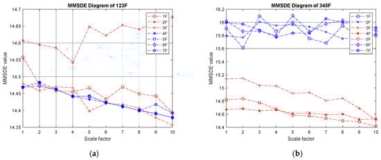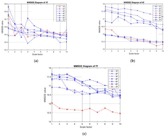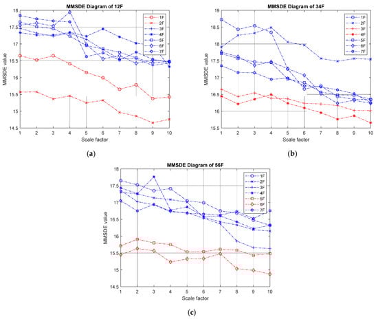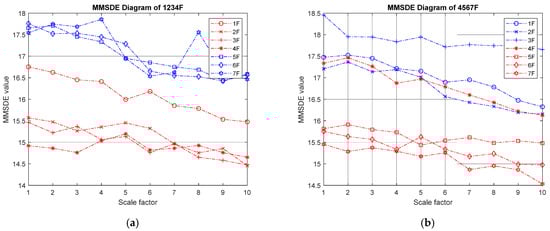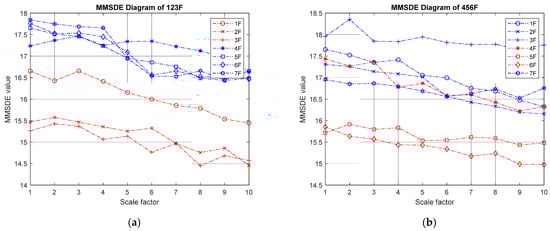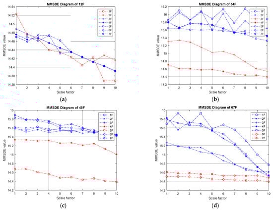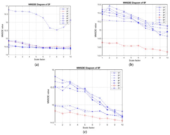 Figure 16 shows the damaged MMSDE diagram of damage on two stories. In the case of two-story damage, the entropy curves of healthy and damaged floors gather in the opposite direction when diagonal braces are removed, and the entropy of the damaged floors is slightly decreased under different scales. In the cases of 1 F–2 F and 2 F–3 F consecutive damage shown in Figure 16a,b, the maximum entropy value of the damaged floor reduces significantly to less than 17. In Figure 16c, the entropy curve of the damaged floor is clearly separated from the entropy curve of the healthy floor; the maximum entropy value drops below 16.