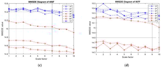 (II) Two-story damage: the MMSDE entropy curve for the two-story damage conditions is shown in Figure 6. The respective MMSDE curves of healthy and damaged floors are speculated to distribute in opposite directions. However, in the case of low-floor damage, it can be seen that the curve of the damaged floor and the healthy floor cannot be clearly distinguished in Figure 6a, which leads to a misjudgment. In Figure 6b,c, the maximum values of the entropy curves of the consecutive failures on the third and fourth floors and the consecutive failures on the fourth and fifth floors are reduced to less than 15.4. In Figure 6d, the maximum value of the entropy curve of the damage on the sixth and seventh floors is reduced to approximately 14.6, and a significant difference between the failure and the healthy floor curve can be observed.