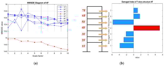 As the damaged floor cannot be clearly distinguished by the MMSDE curve, a misjudgment may occur. The damage index (DI) is proposed as a further quantitative judgment for damage detection. The results of damage on the fourth floor are shown in Figure 8a,b. In the entropy curve, except for the fourth floor, the entropy values of other floors increase compared to the reference. From Figure 8a, it can be seen that the entropy value of the healthy floor increases, but the entropy value of the damaged floor itself decreases significantly. The entropy values of the first floor and the second floor on scales 2 and 3 fluctuate significantly, but the result does not affect the judgment of the damaged floor by DI. According to the DI shown in Figure 8b, the fourth floor can be clearly determined as damaged.