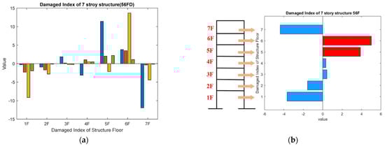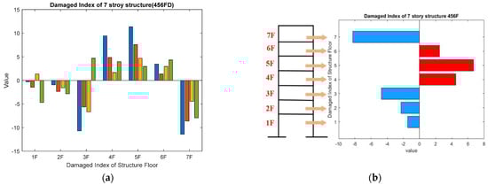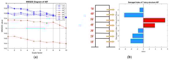 The damage results of the fourth and fifth floor damage are shown in Figure 9a,b. Figure 9a shows that the curves for the fourth and fifth floors are lower than those for the undamaged floors. The entropy values of the healthy floor and the damaged floor are concentrated, respectively. Except for the entropy curve of the fifth floor, the values of the other floors are increased compared to the initial reference, while the curve of the fifth floor is not changed significantly. The damage index indicates that the fourth and fifth floors are damaged.