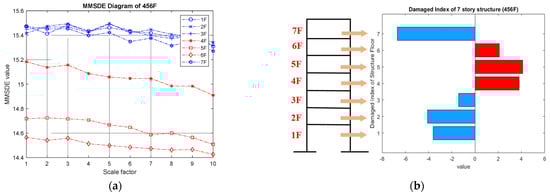 Figure 15 shows the damaged MMSDE diagram of the single-story condition in this seven-story experimental model. In Figure 15a, the entropy curve of the damaged floor jumps up and down; therefore, the damaged floor cannot be distinguished significantly. It is presumed that this inconspicuous trend was caused by the inevitable noise signal measured by the velocity meter in the experiment. In Figure 15b, the entropy curves of the first, second, and third floors show an upward trend, as previously predicted, and the entropy curve of the fourth floor show a downward trend. The second floor MMSDE value shows a very different pattern due to the relatively high reference entropy curve established from the health condition. In the case of 7F damaged, the entropy value of the MMSDE curve reduces significantly after the bracing is removed, and the entropy values of the undamaged lower floors increased.