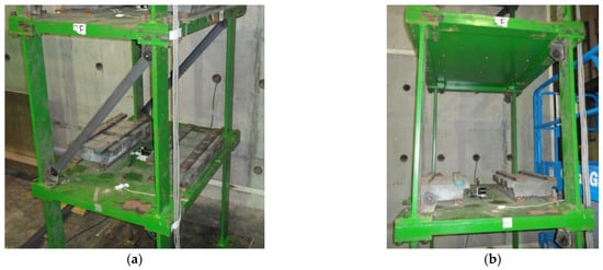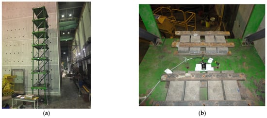 Experimental installation of destructive and non-destructive structures; (a) undamaged condition (no bracing removed); (b) damaged condition (bracing removed).