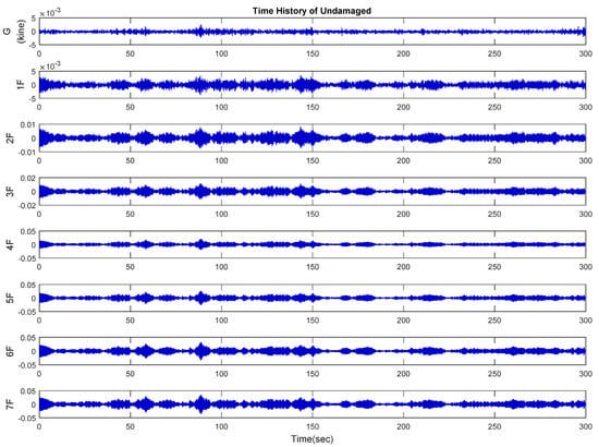 The VSE-15D sensor was deployed in this experiment, recording the ambient vibration from the weak axis in the center of the floor. Each damage case was measured at 200 Hz for five minutes. The velocity response signal of the case without damage is shown in Figure 13. The top-floor signal of each damage case was processed by fast Fourier analysis (FFT) to confirm the signal quality of the experimental data, and the results are listed in Table 3. As indicated, the frequency of undamaged condition is 3.34 Hz, which is the highest in the table. Due to structural damage, the fundamental frequency gradually decreased, indicating that the removal of diagonal bracing has an increasing impact on the overall rigidity and stiffness of the structure.