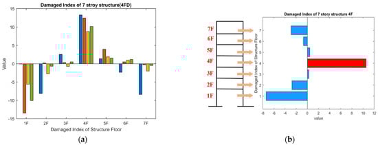 The experimental MMSEE diagram of damage on four stories; (a) damage on the first floor, second floor, third floor, and fourth floor; (b) damage on the fourth floor, fifth floor, sixth floor, and seventh floor.