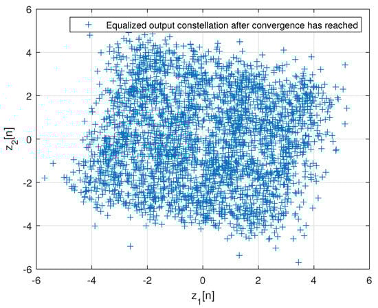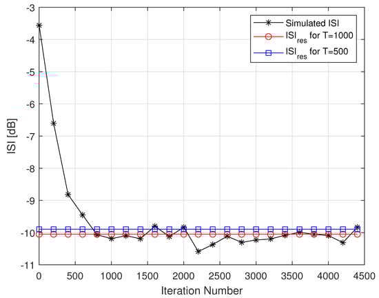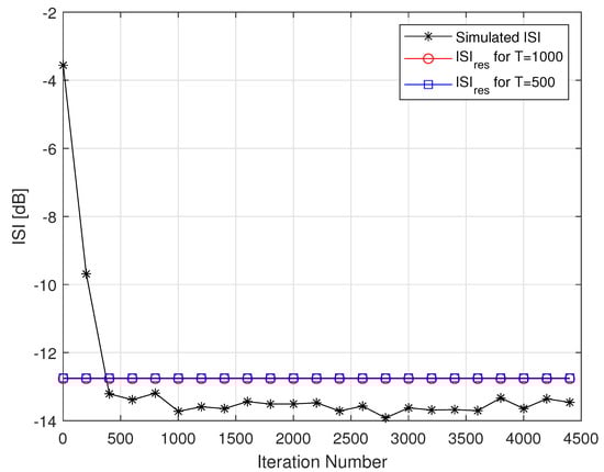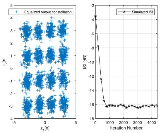 Figure 2 describes the averaged ISI and equalized output constellation obtained for Godard’s algorithm [], where decisions on the equalized output sequence can be made rather reliably. Figure 3 describes the comparison between the simulated ISI with Godard’s algorithm [] and with those calculated via the expression for the residual ISI given in (11) for two different values for T and using the values for , and associated with Godard’s algorithm []. According to Figure 3, the simulated ISI is above the [dB] where decisions on the equalized output sequence cannot be made in a reliable manner as it can be clearly seen from Figure 4. According to Figure 3, the calculated residual ISI (11) for both cases ( and ) is above the obtained level for the simulated ISI. Thus, we have shown here via simulation that the Gaussian assumption for the convolutional noise pdf can be approximately made just before the equalizer has converged, even at a residual ISI level where no trustworthy judgements can be made. Next, we apply the MMA algorithm [,] for the blind adaptive equalization task. Figure 5 describes the comparison between the simulated ISI with the MMA algorithm [,] and with those calculated via the expression for the residual ISI given in (11) for two different values for T and using the values for , and associated with the MMA algorithm [,]. According to Figure 5, the simulated ISI is above the [dB] where decisions on the equalized output sequence cannot be made in a reliable manner as it can be clearly seen from Figure 6. According to Figure 5, the calculated residual ISI (11) for both cases ( and ) is above the obtained level for the simulated ISI. Thus, also here, we see via simulation that the Gaussian assumption for the convolutional noise pdf can be approximately made just before the equalizer has converged even at a residual ISI level where no reliable decisions can be carried out. Please note that we used and since according to (12) the value for T should be .