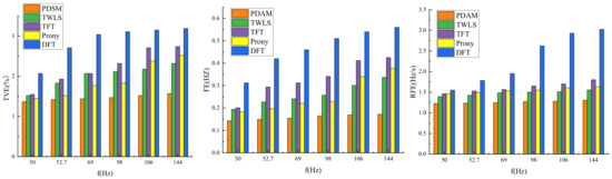 It can be seen from Table 5 that, under the test conditions of noise interference, the maximum TVE of the algorithm proposed in this paper is 2.21%, the maximum FE is 0.462 Hz, and the maximum RFE is 2.09 Hz/s. The maximum TVE, FE, and RFE of the TWLS algorithm are 2.83%, 0.612 Hz, and 2.54 Hz/s, respectively. The maximum TVE, FE, and RFE of the TFT algorithm are 5.78%, 1.321 Hz, and 5.38 Hz/s, respectively. The maximum TVE, FE, and RFE of the Prony algorithm are 3.69%, 1.074 Hz, and 3.932 Hz/s, respectively. The maximum TVE, FE, and RFE of the DFT algorithm are 6.84%, 1.532 Hz, and 6.93 Hz/s, respectively. In the case of noise interference, the IEEE’s maximum TVE, FE, and RFE values are 1.64%, 0.124 Hz, and 2.32 Hz/s, respectively. It can be seen from the data in Table 5 that only PDSM meets the IEEE standards. This is due to the fact that PDSM can strengthen the normalization constraints of the reconstruction problem by using the correlation between the coefficient matrices when building the compressed sensing model. The solution space is reduced, and noises are effectively suppressed, thus achieving the highest measurement accuracy.
