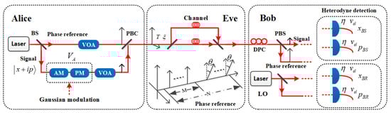 For simplicity, we assume the time-polarization multiplexing system for GMCS LLO CVQKD protocol based on heterodyne detection [,] are adopted, as illustrated in Figure 1. Alice prepares few-photon coherent state as quantum signal, in which the two orthogonal quadratures and are continuously modulated with Gaussian distribution centered on zero and with variance . Here, is the shot noise variance, and all noise variances in this paper are expressed in shot noise units (SNU). The coherent-state quantum signal is interleaved with the time-delayed phase reference and transmitted through an untrusted quantum channel that is characterized by transmittance and excess noise . On the receiver side, Bob performs heterodyne detection using a locally generated LO pulses to measure both quadratures of the quantum signal simultaneously. He also performs heterodyne detection to measure both quadratures of the phase reference simultaneously so as to estimate the phase rotation of the quantum signal between Alice’s and Bob’s independent lasers frames. That is reasonable because the phase reference and the quantum signal are generated from the same laser and experience similar environmental effects. The coherent detector features an efficiency and electronic noise . After Alice and Bob obtain the correlated Gaussian variables as raw key, they can perform postprocessing, including parameter estimation, error correction, and privacy amplification, to get a secret key.