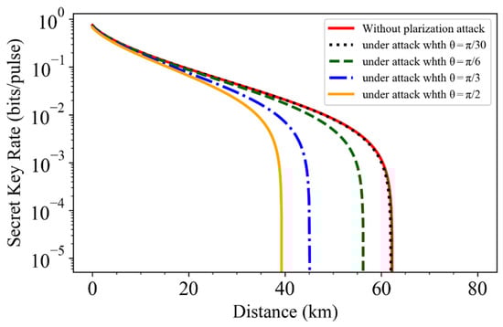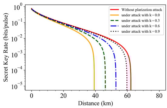 Therefore, under the polarization attack, the total channel-added noise is increased while the detector-added noise is reduced, which will cause Alice and Bob to overestimate the secret key rate. Combining the above scheme with the calculations from Equations (10)–(14), we can get the key rate under the polarization attack.