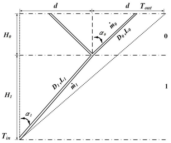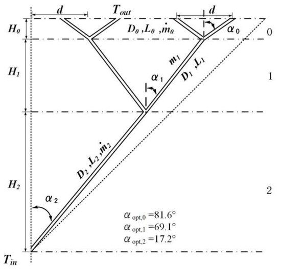The LVCs are a self-similar branching network composed of circular section channels. The ith channel with two branches with the same diameter and length assemble into (i + 1)th-level channel. The first order LVCs with turbulent convection heat transfer are shown in Figure 1. The fluid flows into the root of LVCs and flows out from the crown of LVCs, and convection heat transfer occurs between the inner walls of LVCs and the fluid. For each level, the length is Li, and the vertical distance is Hi. The temperature of fluid is Tin (K) at the entrance and Tout (K) at the outlet.