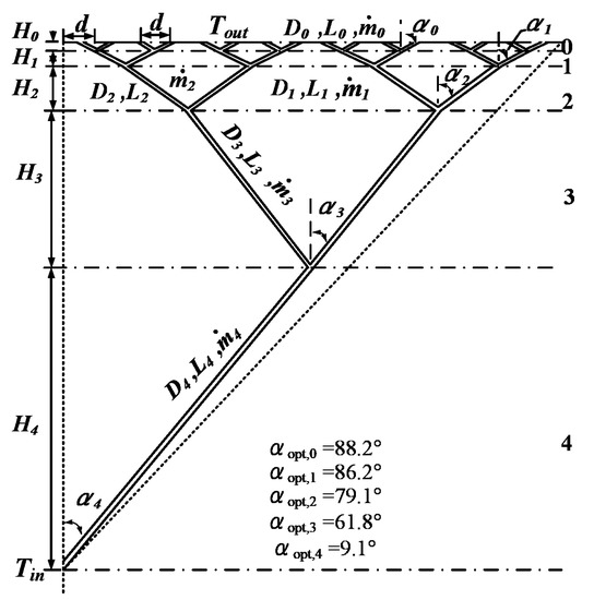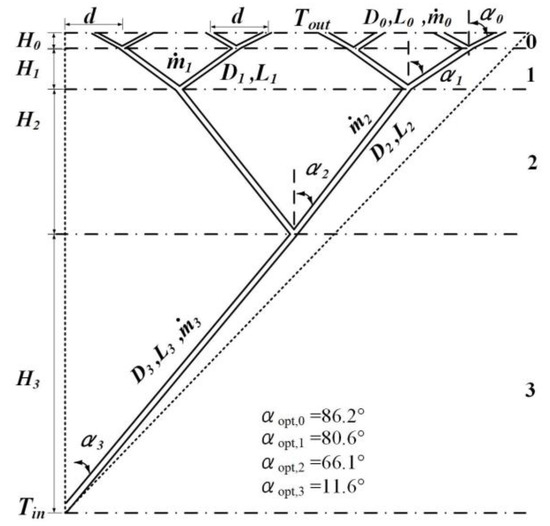The third order LVCs with the angles as optimization variables are shown in Figure 3. Combining Equations (3), (5), (6) and (10) with the geometric characteristics of the third order LVCs, the dimensionless total entropy generation rate of the third order LVCs with turbulent convection heat transfer can be obtained: