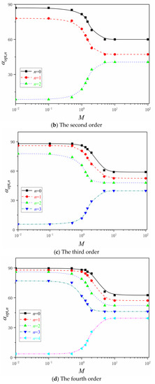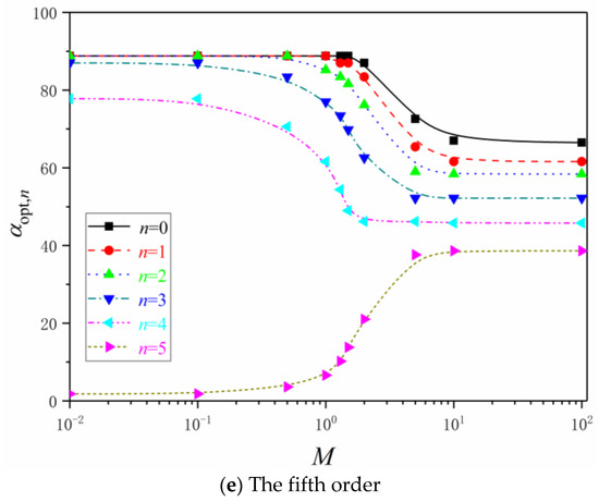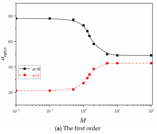 According to Equation (18), when the dimensionless mass flow rate M is constant, the dimensionless total entropy generation rate is only related to the four angles , , and . When the dimensionless mass flow rate , the optimal angles , , and . The dimensionless total entropy generation rate decreases by 43.75% compared with that of the third order LVCs with fixed angles ().
