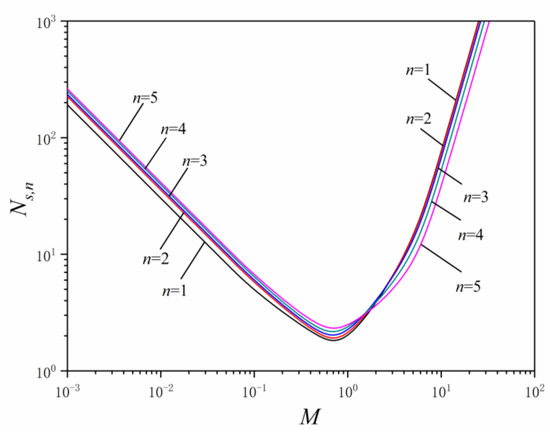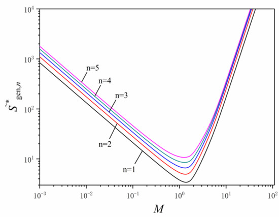 When the dimensionless coefficient =1, the influences of the dimensionless mass flow rate on the dimensionless total entropy generation rate are shown in Figure 6. For any n, the dimensionless total entropy generation rate first decreases and then increases sharply with the growth of the dimensionless mass flow rate , this change is attributed to the sharp increase of EGR produced by fluid heat exchange when the mass flow is small and the sharp increase of EGR produced by fluid flow when the mass flow is large. When the dimensionless mass flow rate is between 1 and 2, there are optimal dimensionless mass flow rates that can make the dimensionless total entropy generation rate with any order to reach their respective minimums.