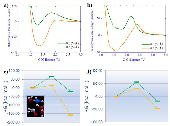Another pivotal result afforded by those simulations was the attempt to quantitatively measure the thermodynamic supply provided by the external field during the observed chemical reactions. In fact, most of the detected chemical transformations occurred on timescales on the order of 2–3 picoseconds (ps) and were accompanied by a potential energy drop, indicating favorable exothermic mechanisms [38]. In addition, some preliminary simple metadynamics calculations were executed in this seminal work to figure out the free-energy contribution carried by external static fields when some crucial carbon-to-nitrogen (Figure 1a,c) and carbon-to-carbon (Figure 1b,d) are formed in the system, as shown in Figure 1.
