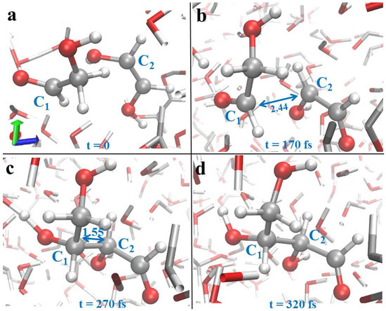 Formation of (D)-erythrose as reported and detailed in [40]. Carbon-to-carbon (C-C) distances are highlighted in Å. When an aqueous solution of glycolaldehyde was exposed to a static and homogeneous electric field of 0.45 V/Å, a newly synthesized 1,2-ethenediol reacts with a glycolaldehyde species (a) giving birth to a glycolaldehyde enolate (b). This way, the creation of a novel C-C bond takes place (c) and a (D)-erythrose molecule is synthesized rapidly (d).