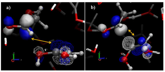A key feature of these kind of advanced computational techniques is that they offer the possibility to track and directly visualize not only the behavior of the nuclei but also that of the electron densities to better interpret the field-induced formation of a new carbon-to-carbon bond in a system originally composed of glycolaldehyde and water, and also analyses of the kind of the frontier molecular orbital (FMO) may be exploited. By evoking the FMO theory [102], informative molecular orbitals such as the highest occupied molecular orbitals (HOMO) and the lowest unoccupied molecular orbitals (LUMO) of the two interacting molecules, which for a field strength of ∼0.5 V/Å yielded (D)-erythrose in a glycolaldehyde-water mixture, were determined [40]. The HOMO of the enol tautomer—subsequently evolving into a glycolaldehyde enolate species—and the LUMO of the neighbor glycolaldehyde molecule were evaluated, as shown in Figure 3. The most reactive HOMO of the 1,2-ethenediol species is delocalized all along the molecule, whereas the first LUMO of glycolaldehyde is located between the oxygen of the carbonyl group and the -carbon (Figure 3a). Although this latter atom is close to the oxygen atoms of the 1,2-ethenediol, the confined spatial extent of the LUMO along with a nontailored phasing characterizing the interaction between the closest HOMO and LUMO prevents the formation of a carbon-to-oxygen covalent bond between these molecules (Figure 3a). Rapidly, indeed, (as highlighted in Figure 2), the system finds a configuration exhibiting the most expanded HOMO of the 1,2-ethenediol and the biggest LUMO of the glycolaldehyde as first-neighbor molecular orbitals which are in-phase. All these circumstances lead to the formation of the C-C bond producing the (D)-erythrose molecule [40].