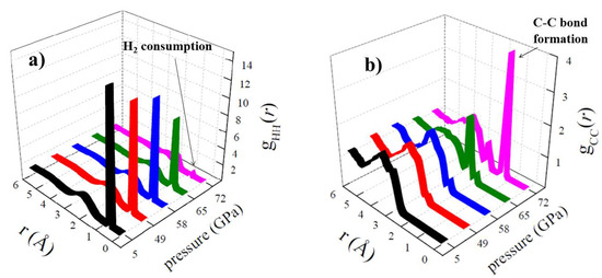 (a) Hydrogen-hydrogen and (b) carbon-carbon RDFs for different shock pressures, determined after decompression of the simulation boxes in ab initio molecular dynamics simulations coupled with the multiscale shock-compression technique.