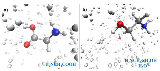 Snapshots of the simulation boxes containing glycine (a) and ethanolamine along with water (b) in compressed environments composed of molecular hydrogen.