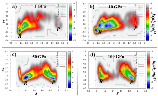 Free-energy landscapes determined from ab initio molecular dynamics and metadynamics methods of the conversion of glycine (reactants, R) into ethanolamine and water (products, P) in the space spanned by the path Collective Variables s and z (see text and Methods section) at pressures of 1 (a), 10 (b), 50 (c), and 100 GPa (d).