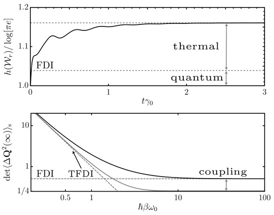 (top) Phase space entropy for positive Wigner functions (Equation (22), normalized to the minimal uncertainty ) as a function of time (measured in multiples of the dissipation rate). We employ the bath spectral density of Equation (A48) and use parameters , , and dimensions where as well as choose for the initial conditions. The lower dashed line gives the lower bound prescribed by the fluctuation–dissipation inequality (FDI) at late times (Equations (12), (13) and (22)), which can be connected to quantum fluctuations in the coupled system+bath system. The upper dashed line gives the exact late time limit of the Gaussian evolution (Equations (22) and (A12)), which also includes thermal fluctuations (see Section 4.1). (bottom) Late-time quantum uncertainty [Equations (9) and (A13)] as a function of , i.e., a measure of the respective impact of quantum or thermal fluctuations. For finite system–bath coupling (black, solid line; ), the uncertainty always exceeds the minimal bound of given by the Robertson–Schrödinger equation and saturates the fluctuation–dissipation inequality for (gray, horizontal, dashed line). This discrepancy fades for smaller coupling (gray, solid line; ). Additionally, for , thermal fluctuations start to prevail over the quantum fluctuations, and the more accurate bound (comparing to the FDI) can be provided by the thermal fluctuation–dissipation inequality (TFDI; gray, dashed, nonhorizontal line; see Section 4.1).