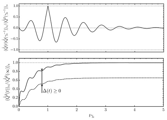 Numerical evaluation of the symmetric fluctuations of the system’s momentum operator solely connected to the fluctuating dynamics (see Equation (15)) as a function of time in multiples of the dissipation rate . We employ the -model in Equation (A48) for the bath spectral density and use parameters , , and and work in dimensionless units where . (top) Two-time correlation centered at the dissipation time and normalized to its equal-time correlation at . At , the apparent kink is owed to the numerical resolution in time. The curve is smooth. (bottom) Equal-time correlation normalized to its late-time limit (solid). Lower bound prescribed by thermal fluctuation–dissipation inequality (dashed). The difference between the two is given by (Equation (28)).