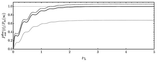 Outgoing power connected to the fluctuating dynamics of the system (Equations (17) and (31)) as a function of time in multiples of the dissipation rate . Parameters are chosen as in Figure 2. We normalize to the expression for the ingoing power at late times [Equation (14a)] in order to indicate the balancing of the two at equilibrium (solid line). We further report the corresponding expression using the thermal fluctuation–dissipation inequality, i.e., replacing in the numerical evaluation, which is always smaller than the full expression (dashed). Lastly, we give the upper estimate of Equation (42) (dotted).